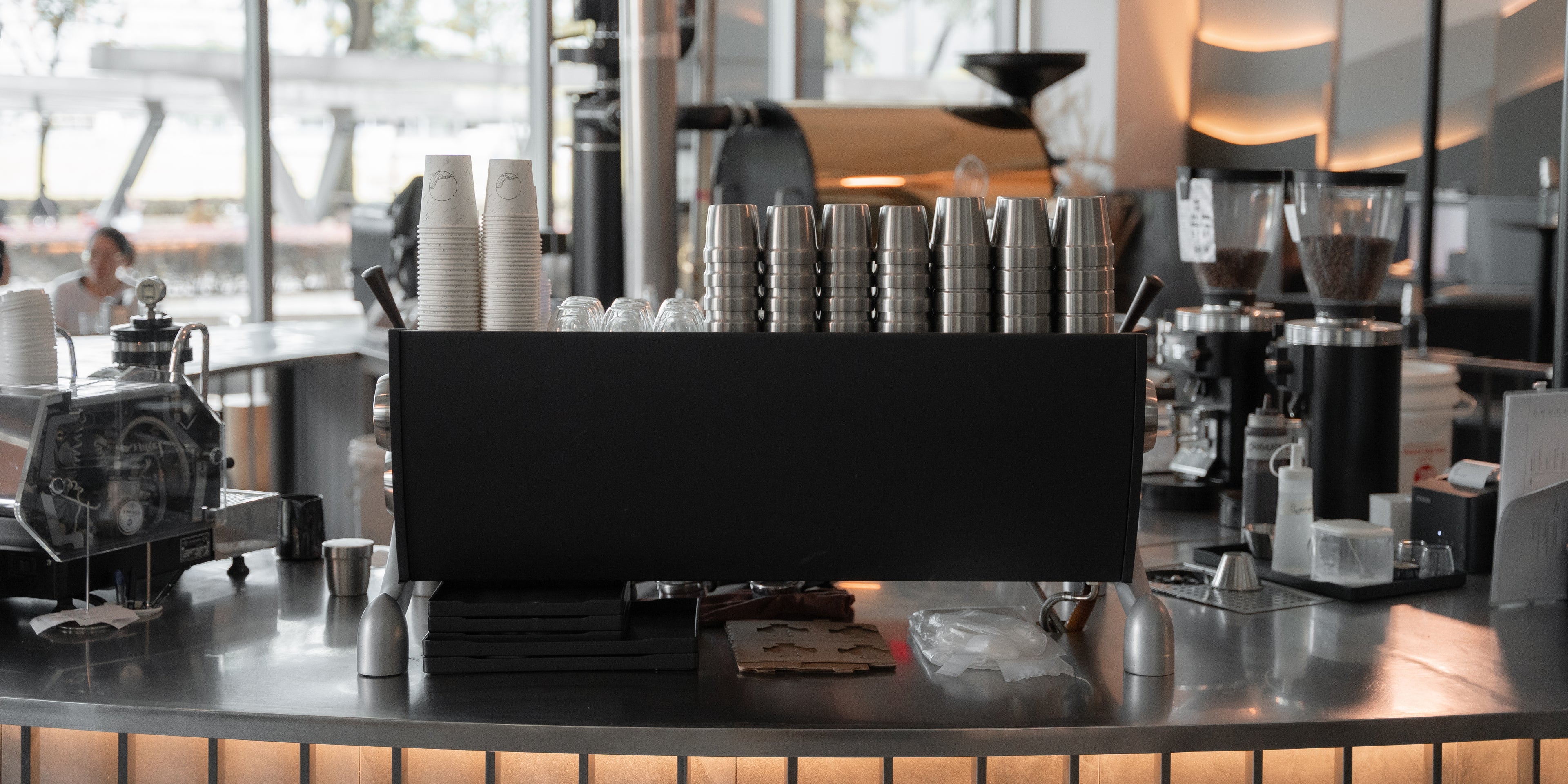 This is our small retail corner in the outlet. We got freshly roasted coffee beans, coffee tools, and merch.